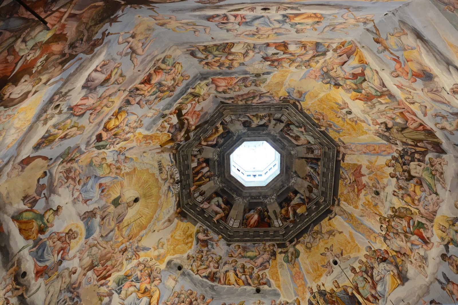 Here is a photo of the inside of the Duomo's dome. The architect of the dome was Brunelleschi, and it was added some time after the completion of the rest of the cathedral. It was the very first Renaissance dome and the model for domes to follow. The frescoes here are of the last judgement.